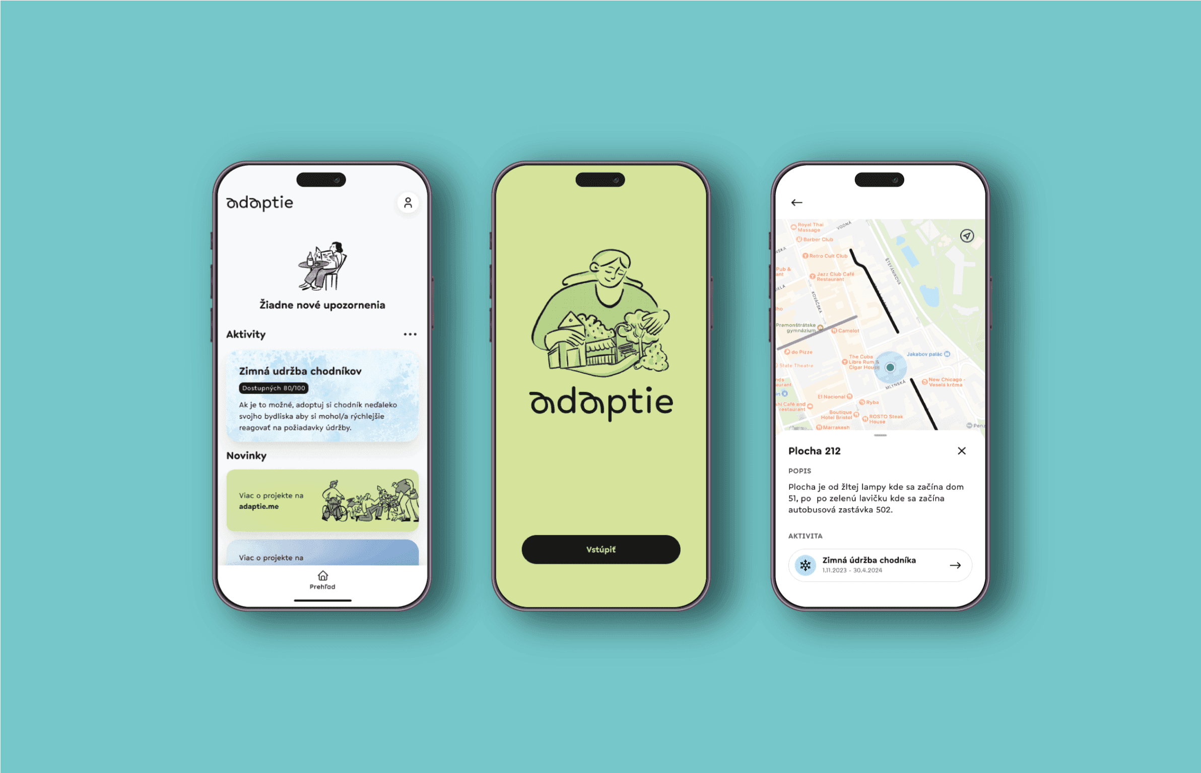 - Po prihlásení sa dostaneš rovno na základnú obrazovku, kde po kliknutí na "kartičku" Zimná údržba chodníka sa zobrazí mapa s voľnými úsekmi. Na mape si zvoľ úsek, ktorý ti vyhovuje, a aplikácia ťa následne prevedie adopciou úseku. Pozor, bez povolenia svojej polohy si nebudeš môcť adoptovať úseky.